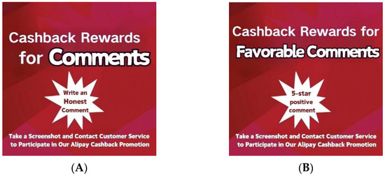 Writing online reviews is an active way for consumers to participate in the marketing process. This interactivity becomes a critical part of marketing practices [1]. Positive online reviews can boost sales significantly [2,3,4,5,6]. Cashback rewards are the most prevalent incentive that sellers on platforms (e.g., Tmall, Buy Together and eBay) use to encourage consumers to write favorable comments [7,8]. CRFC incentives have become an effective tool in interactive marketing. Cashback rewards are only given if consumers give a five-star rating and write favorable comments. Extant research focuses on how and why monetary incentives promote review-writing in the interactive marketing area [9]. The offer of a cashback reward may instantly increase consumers’ intention of giving a five-star rating and writing favorable comments. However, consumers’ repurchase and recommendation intentions are indispensable indicators of loyalty and future profitability [10,11]. Given the significant role of CRFC incentives, this research aims to answer the following important question: how does a CRFC influence repurchase and recommendation intentions?