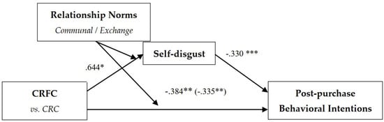 Self-disgust is “an originally food-related emotion, expanded, both in biological and in cultural evolution, to become a guardian of the body, the social order, and the soul” [42]. This emotion functions not only as a defensive mechanism to protect against potential pathogens that threaten physical purity [43], but also arises in response to transgressions of moral and spiritual purity [44,45]. The underpinning of self-disgust is a purity violation [45,46,47,48,49], and the offer of a CRFC violates communal consumers’ mental purity. Consequently, this study elucidates the mediating role of self-disgust in the interactive effect between CRFC and relationship norms on post-purchase behavioral intentions. Specifically, a CRFC triggers self-disgust in communal consumers, thereby diminishing their intentions of repurchase and recommendation.