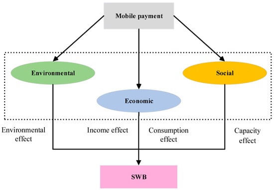 As indicated in the literature review part, SWB is determined by multidimensional factors from economic, social, and environmental systems. Therefore, we briefly summarize the connection between mobile payment and SWB from an economic–social–environmental perspective (as shown in Figure 1).