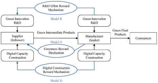 In order to meet green standards for products, suppliers and manufacturers need to carry out their green innovation, so they invest in green innovation R&D of green intermediate and final products respectively. Simultaneously, under the current wave of the digital economy, all enterprises, including manufacturers and suppliers, are committed to digital transformation. They are actively engaged in digital construction to enhance their digital capabilities. The current research indicates that data can spur innovation [9,11]. Additionally, enhancing an organization’s digital capabilities can significantly promote the green innovation behaviour of manufacturing firms and enhance their environmental performance [20,22,43]. Thus, active digital construction by suppliers and manufacturers can increase the greenness of products and meet the current environmental protection requirements. The structure of the process and the interaction between the manufacturer and supplier are shown in Figure 1.
