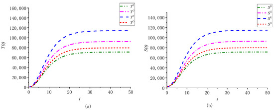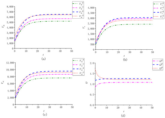 Proposition 1 demonstrates that the optimal selling prices of green intermediate and final products, the optimal green innovation R&D effort level, and the digital capability level of the manufacturer and the supplier have no relationship with the greenness, while profits are positively correlated with the greenness of intermediate and final products. The evolution rates of the greenness of intermediate and final products are the same as the decay factors of their corresponding greenness. In addition, the convergence of the greenness is related to the stable value. When , the greenness of intermediate products gradually rises with time and converges to and its growth law has a marginally decreasing effect. Similarly, when , the greenness of final products gradually grows over time and converges to . This is consistent with the actual situation. Due to the financial and technological constraints of green innovation R&D efforts, the advancement of the greenness of intermediate and final products gradually declines over time and the promotion effect of digital capability level on green innovation also gradually weakens.