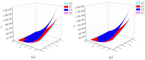 where and , respectively, represent the effective coefficients for the supplier and manufacturer to carry out green innovation R&D efforts; and , respectively, denote the effective coefficients of digital construction promoting product green innovation by the supplier and manufacturer; is the influence coefficient of the greenness of intermediate products on the greenness of final products; and , respectively, refer to the decay factor of greenness of intermediate and final products. Let and . Equations (1) and (2) indicate that the greenness of intermediate and final products are positively correlated with the green innovation R&D effort and digital capability of suppliers and manufacturers, respectively, which is consistent with reality. This linear relationship has been widely used in the literature on environmental games and innovation games (e.g., Liu and De Giovanni [3], Zhu et al. [5] and Chang et al. [55]).
