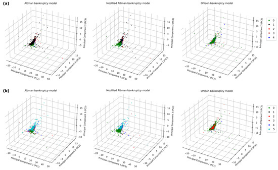 Three-dimensional principal component analysis (PCA) of U.S. healthcare industries features: This figure illustrates the PCA plots of 1265 U.S. healthcare industries, visualized in three-dimensional space through the first three principal components. This analytical approach is used to identify patterns regarding (a) bankruptcy across different medical industry subsectors and (b) bankruptcy relative to market capitalization categories. Each data point represents a unique stock, with its spatial positioning derived from an aggregation of features within the dimensions defined by principal components 1, 2, and 3. In panels (a), industry subsector classes are labeled as 0 for solvency and from 1 to 4 for bankruptcy in biotechnology, medical devices, pharmacology, and healthcare services, respectively. In panels (b), market capitalization classes are defined as 0 for solvency and from 1 to 5 for bankruptcy in large-cap, mid-cap, small-cap, micro-cap, and nano-cap categories, respectively.