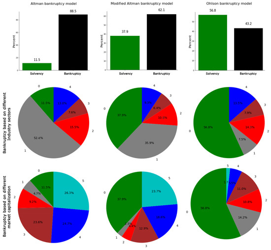 Percentage difference insolvency/bankruptcy prediction across various bankruptcy prediction models. Pie charts display the differences in bankruptcy and solvency percentages based on various industry subsectors and market capitalization classifications using three bankruptcy models. Industry subsector classes are labeled as 0 for solvency and from 1 to 4 for bankruptcy in biotechnology, medical devices, pharmacology, and healthcare services, respectively. Market capitalization classes are defined as 0 for solvency and from 1 to 5 for bankruptcy in large-cap, mid-cap, small-cap, micro-cap, and nano-cap categories, respectively.