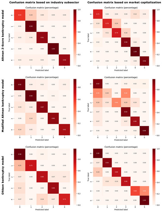 Market capitalization serves as a powerful indicator of a company’s size, reflecting not only the equity value perceived by the market but also providing insight into the financial robustness of the firms. Previous studies have shown that the market capitalization of industries is of particular importance in the analysis of bankruptcy risks [54,55,56]. On the other hand, in examining bankruptcy risk in the healthcare industries, industry subsector classification plays a pivotal role, as each subsector contributes distinct elements to the overall risk profile. Given the significance of both market capitalization and industry subsectors in bankruptcy risk analysis, this study employs two approaches: Bankruptcy risks are analyzed based on the industry subsector and the market capitalization of industries. This dual perspective enables a nuanced assessment of how industry dynamics and company size characteristics interact to influence bankruptcy likelihood. To implement these approaches, we applied two distinct multi-class machine learning classifications. Firstly, the targets were classified into four different industry subsector classes. Secondly, the targets were classified into five different market capitalization classes. It is important to note that we had three targets (Altman Z-Score, modified Altman, and Ohlson bankruptcy models), and as a result, we repeated the entire machine learning multi-class classification procedure three times. Finally, the algorithm’s predictions were compared to the test outcomes using confusion matrices to evaluate accuracy, precision, recall, and F1 scores. The algorithm with the best performance metrics was selected as the final method for bankruptcy prediction. It is worth mentioning that all targets were not completely balanced. Hence, we employed stratified sampling in the train–test split to preserve the target variable bankruptcy distribution in both training and testing sets. Additionally, StratifiedKFold cross-validation was used, demonstrating the suitability of our chosen methodology for maintaining the proportion of classes across folds. These primary techniques effectively solved issues related to minor imbalances during the prediction process, making advanced methods such as over-sampling or under-sampling unnecessary. The machine learning code was implemented using Python software, version 3.11.