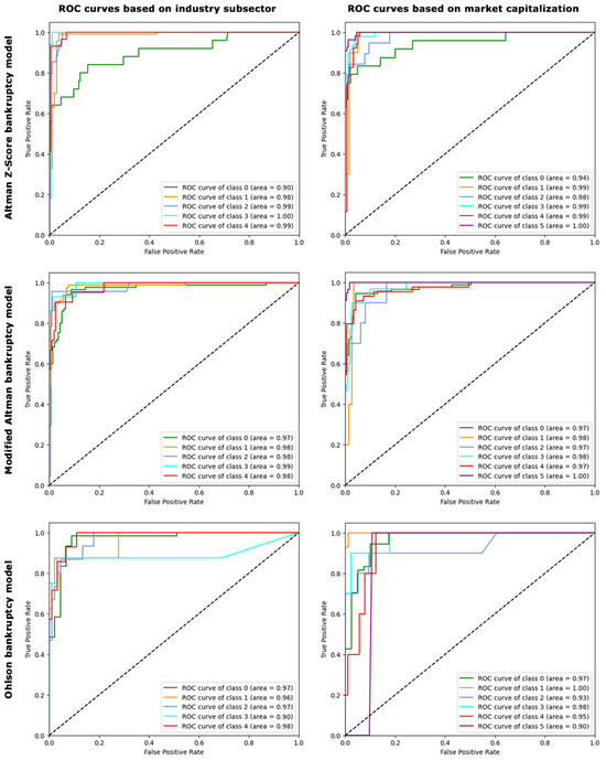 Given the critical importance of minimizing false negatives in bankruptcy prediction, where failing to identify an impending bankruptcy could have drastic financial repercussions, the receiver operating characteristic (ROC) curve’s ability to illustrate the trade-off between sensitivity (true-positive rate) and specificity (false-positive rate) across different thresholds makes it a fitting choice. It facilitates the identification of an optimal balance, ensuring that the model minimally overlooks actual cases of bankruptcy, which is of paramount concern in financial analytics. Therefore, we compared ROC curves in Figure 4 based on different bankruptcy models and classifications for the gradient boosting model. The areas under the ROC curves for the Altman Z-score, modified Altman, and Ohlson bankruptcy prediction models were notably high (greater than 90%) for classifications based on industry subsectors and market capitalization. The high ROC curve areas show the exceptional capability of our gradient boosting algorithm in differentiating bankrupt from solvent healthcare industries. This suggests not only the accuracy of our predictions but also confirms their consistency and robustness across diverse industry contexts and varying scales of market capitalization. The superior performance of the gradient boosting model and the suitable size of our dataset reinforce the notion that this efficient and transparent model is advantageous, particularly in scenarios where complexity is unnecessary, and high-dimensional deep learning approaches do not confer additional benefits.