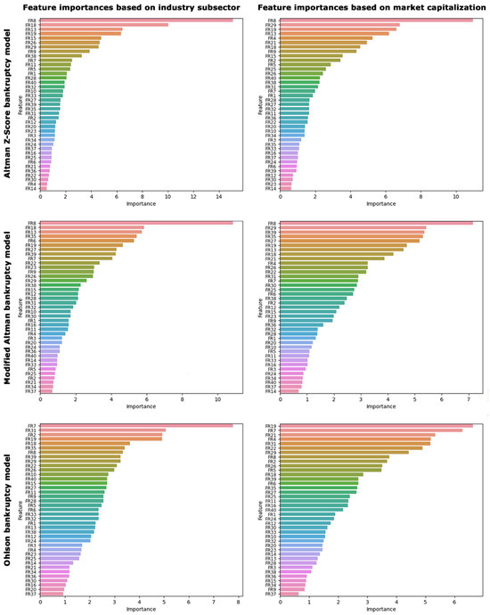 Feature importance analysis highlighting the relative importance of each financial ratio in determining bankruptcy risk based on different industry subsectors and market capitalizations.