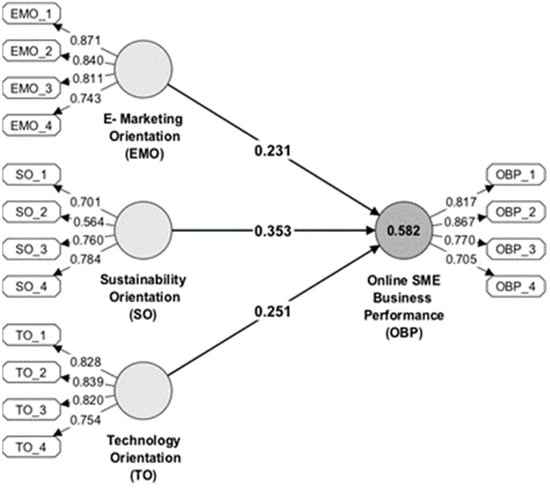 We followed [42,48,109,110] and measured e-marketing orientation (EMO) with four items, taking into account the use of e-marketing resources to communicate with the target audience (EMO_1), ensure continuity of traditional activities (EMO_2), perform transactions (EMO_3), and build and use a customer database (EMO_4) necessary for streamlining the marketing activities of online SMEs. The interest of online SMEs in sustainability orientation (SO) focused on achieving human resources development goals (SO_1), achieving economic goals (SO_2), achieving social protection goals (SO_3), and achieving environmental and climate goals (SO_4), adapted from studies [53,111,112].