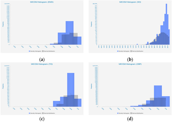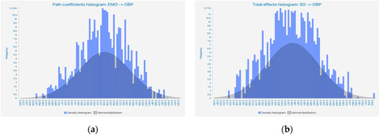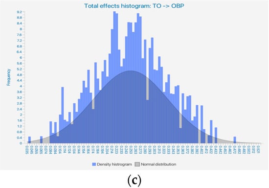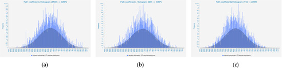 In Figure 3, three histograms can be visualized, illustrating the dispersion of estimated values between the iterations EMO → OBP, SO → OBP, and TO → OBP. For instance, histogram (b) below shows, for the path model from SO to OBP, a more complex distribution of path loading coefficients, unlike histograms (a) and (c).