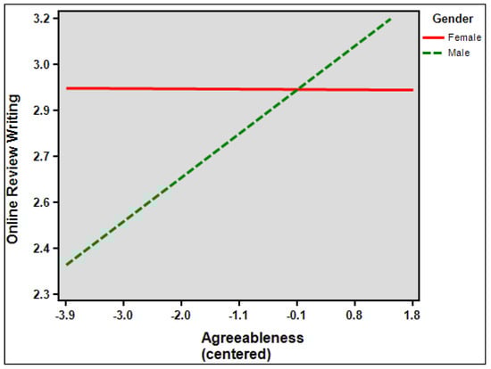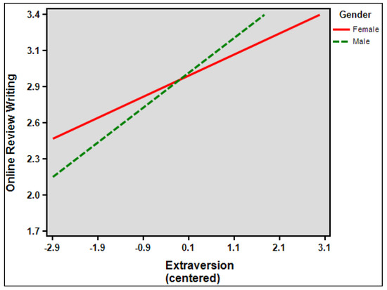 Extraverts are socially active and seek stimulation from others. They have a higher sense of control over stress [124]. Males’ more resilient psychological response and sense of control suggest that they are more likely to rely on their self-efficacy and experience when needing information, and they feel that they are in control of the environment [20,125]. Gender difference has been found in assertiveness as a related measure of extraversion, further suggesting that males desire agency and dominance [116,126]. Thus, males are less inclined to be persuaded but prefer to be persuasive. In other words, compared with females, males are less likely to be influenced by their extraversion when using online reviews. We hypothesize the following: