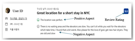Choosing a city or region for the study was a critical decision, balancing generalizability with the usual limitations of resources and time with meaningful findings to serve as a foundation for further research. For this study, London was selected as the data source location for several reasons. Hotels in the UK provide an extensive database and have a balance of domestic and international travelers, a balance of business and leisure travelers, and diversity among the international travelers, thus providing more meaningful findings from a single data source. Booking.com was selected as the data source because it is the most extensive review site and contributed 31.6% of the review volume in 2020 []. Additionally, the textual content of online reviews posted on Booking.com consists of positive (“pros”) and negative (“cons”) aspects of hotel services, reflecting the different aspects of service dimensions. These aspects contribute to an understanding of whether sensory service experiences, together with other elements of service evaluation (“pros” and “cons”), played a different role in shaping online review generation and consumption during the COVID-19 period. For online review generation, attention was paid to the review ratings, while for online review consumption, perceived review helpfulness was examined. Figure 1 shows an example of an online review posted on Booking.com.