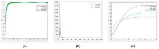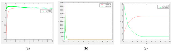Since there is no significant increase in the number of consumers purchasing the product, coupled with a certain degree of reduction in the equilibrium pricing of companies, the profits of the company correspondingly decrease. This is reflected in the figure by a decrease in the peak of profits. Furthermore, through the analysis of numerical experiments in Figure 2, it can be observed that the company has a negative profit region. This is primarily because at the initial time t = 0, the company’s pricing is still low, resulting in low demand and, thus, minimal revenue. Simultaneously, the cost incurred by the company to produce and maintain the quality level of the products sold significantly impacts its profits. However, over time, the pricing of companies continues to increase, and WOM among consumers gradually spreads signals of product excellence. Consequently, enterprise profits rapidly increase, rendering them profitable in the current period. Nevertheless, continuously increasing pricing will somewhat reduce the number of consumers willing to purchase the product on the market. Since the total cost incurred by the company is fixed, profits ultimately exhibit a decreasing trend.
