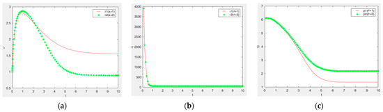 These findings reveal that the level of advertising can either enhance or mitigate the positive or negative impacts of WOM. Additionally, changes in advertising levels affect a company’s advertising costs. Therefore, in this section, we investigate the evolution of company profits when advertising levels change. First, we use the results from the first numerical experiment in Section 5.1 as a benchmark for comparative analysis. In this experiment, . In this section, the values of the adjusted advertising level are a = 1 and a = 2, respectively. The profit and company price formulas are shown in Table 4. The numerical simulation image is shown in Figure 2.