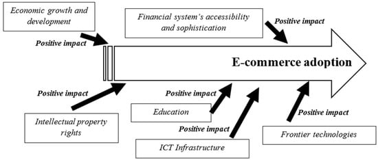 There is a general consensus about the positive impact of technology and innovation on e-commerce development and growth, on the fact that information communication infrastructure and technology play an essential role for e-commerce capacity, and the positive influence of the diffusion of innovation for e-commerce adoption and trust [12,13,14]. Ref. [15] found that “connectivity and technological efficacy directly influence e-commerce”, and [16] also concluded that information and communication technology empower the development of e-commerce by improving well-being and living standards.