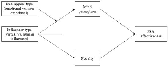 Emotional appeal involves persuasive communication that emotionally engages viewers with the message [56]. In contrast, non-emotional or rational appeal usually focuses on presentation of factual information, characterized by objectivity [57]. Virtual influencers, like their human counterpart, can share feelings and emotions in PSAs. Since the capacity to feel and sense is an important dimension of mind perception, we argue that expressing emotions in PSAs can enhance consumers’ perception of mind in virtual influencers. In contrast, since the mind perception of human influencers is already high relative to virtual influencers, the positive effect of incorporating emotional appeals in PSAs may be less pronounced for them compared to virtual influencers. Therefore, we propose that incorporating an emotional (vs. non-emotional) appeal in PSAs is likely to enhance the effectiveness of virtual (vs. human) influencers’ PSA communications through an enhanced mind perception of virtual (vs. human) influencers. This proposition aligns with past research on virtual influencer brand marketing, showing that virtual influencers who display emotions in product endorsing posts can increase consumer engagement and attitudes [58,59,60]. Thus, we hypothesize the following (see Figure 1 for the full theoretical framework):