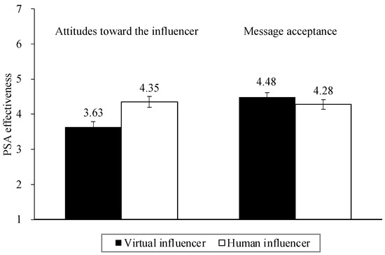 To examine the effect of influencer type on PSA message acceptance, we conducted a one-way ANOVA with influencer type as an independent variable and PSA message acceptance as a dependent variable. The results suggested that the main effect of influencer type on PSA message acceptance was not significant (Mvirtual = 4.48, SD = 1.45 vs. Mhuman = 4.48, SD = 1.47; F(1, 237) = 1.07, p = 0.30, ηp2 = 0.004; see Figure 2). This effect remained insignificant after controlling for participants’ mood, frequency of using plastic, and demographic variables (F(1, 232) = 1.11, p = 0.29, ηp2 = 0.01).