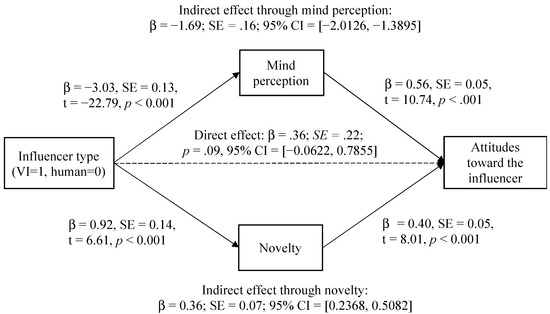 Next, we tested the proposed mediation models. We first examined the mediation effect with attitude toward the influencer as the dependent variable, influencer type (0 = human influencer, 1 = virtual influencer) as the independent variable, and mind perception and novelty as two mediators (PROCESS Model 6; 5000 bootstrap resamples). The results showed that compared with the human influencer, participants perceived a significantly lower mind (β = −3.03, SE = 0.13, t = −22.79, p < 0.001) and higher novelty (β = 0.92, SE = 0.14, t = 6.61, p < 0.001) in the virtual influencer posting a low-carb PSA. Further, both mind perception (β = 0.56, SE = 0.05, t = 10.74, p < 0.001) and novelty (β = 0.40, SE = 0.05, t = 8.01, p < 0.001) had positive effects on attitude toward the influencer. More importantly, consistently with our hypotheses, the indirect effect of influencer type on attitude toward the influencer through mind perception was negative and significant (β = −1.69; SE = 0.16), with a 95% confidence interval excluding zero [−2.0126, −1.3895]. In contrast, the indirect effect of influencer type on attitude toward the influencer through novelty was positive and significant (β = 0.36; SE = 0.07), with a 95% confidence interval excluding zero [0.2368, 0.5082]. Additionally, results suggested that the direct effect of influencer type on attitude toward the influencer was not significant (β = 0.36; SE = 0.22; p = 0.09, 95% CI = [−0.0622, 0.7855]; see Figure 3).
