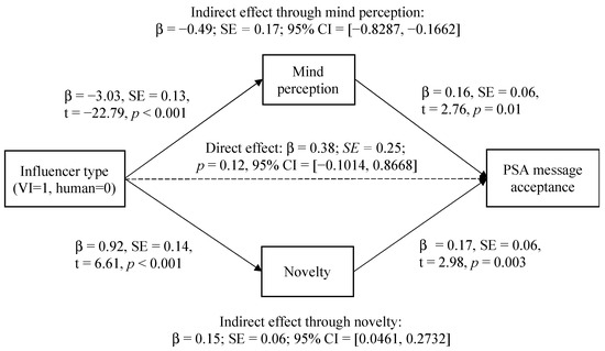 Similarly, we examined the mediation effect on PSA message acceptance. We conducted a mediation analysis with influencer type (0 = human influencer, 1 = virtual influencer) as an independent variable, mind perception and novelty as two mediators, and PSA message acceptance as the dependent variable (PROCESS Model 6; 5000 bootstrap resamples). Similarly to the results above, participants perceived a significantly lower mind (β = −3.03, SE = 0.13, t = −22.79, p < 0.001) and higher novelty (β = 0.92, SE = 0.14, t = 6.61, p < 0.001) in the virtual influencer compared to the human influencer posting a low-carb PSA. Further, both mind perception (β = 0.16, SE = 0.06, t = 2.76, p = 0.01) and novelty (β = 0.17, SE = 0.06, t = 2.98, p = 0.003) had positive effects on PSA message acceptance. More importantly, consistently with our hypotheses, the indirect effect of influencer type on PSA message acceptance through mind perception was negative and significant (β = −0.49; SE = 0.17), with a 95% confidence interval excluding zero [−0.8287, −0.1662]. In contrast, the indirect effect of influencer type on PSA message acceptance through novelty was positive and significant (β = 0.15; SE = 0.06), with a 95% confidence interval excluding zero [0.0461, 0.2732]. Additionally, the direct effect of influencer type on PSA message acceptance was not significant (β = 0.04; SE = 0.16; p = 0.79, 95% CI = [−0.2719, 0.3572]; see Figure 4).