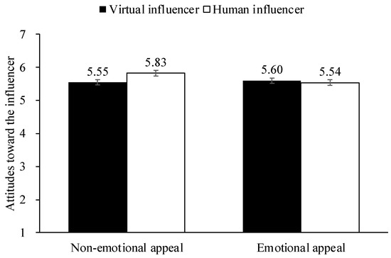 To test Hypothesis 3, a two-way ANOVA was conducted with influencer type as the independent variable, appeal type as the moderator, and attitude toward the influencer as the dependent variable. The results showed that the main effects of influencer type (F(1, 784) = 1.82, p = 0.18, ηp2 = 0.002) and appeal type (F(1, 784) =2.03, p = −0.15, ηp2 = 0.003) on attitude toward the influencer were not significant. Importantly, there was a significant two-way interaction between the influencer type and appeal type on the attitude toward the influencer (F(1, 784) = 4.27, p = 0.04, ηp2 = 0.005). Further contrast analysis suggested that in the non-emotional PSA appeal condition, participants had a more favorable attitude toward the human influencer (M = 5.83, SD = 1.00) than the virtual influencer (M = 5.55, SD = 1.24; F(1, 784) = 5.83, p = 0.02). In the emotional appeal condition, there was no significant difference between the virtual and human influencer conditions on the attitude toward the human influencer (M = 5.60, SD = 1.17 vs. M = 5.54, SD = 1.18; F(1, 784) = 0.26, p = 0.61; see Figure 5). After controlling for participants’ mood, frequency of using plastic, and demographic information, the above interaction effect on the attitude toward the influencer remained significant (F(1, 778) = 3.80, p = 0.05, ηp2 = 0.01).