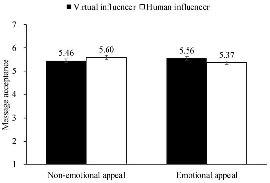 For PSA message acceptance, a two-way ANOVA was conducted with the influencer type as the independent variable, appeal type as the moderator, and PSA message acceptance as the dependent variable. The results showed that the main effects of influencer type (F(1, 784) = 0.09, p = 0.76, ηp2 < 0.001) and appeal type (F(1, 784) = 0.74, p = 0.39, ηp2 = 0.001) on PSA message acceptance were not significant. Importantly, there was a significant interaction between influencer type and appeal type on PSA message acceptance (F(1, 784) = 4.42, p = 0.04, ηp2 = 0.01). A further contrast analysis suggested that in the non-emotional PSA appeal condition, there was no significant difference between the virtual and human influencer conditions on PSA message acceptance (M = 5.46, SD = 1.11 vs. M = 5.60, SD = 1.02; F(1, 784) = 1.61, p = 0.20). In the emotional appeal condition, participants in the virtual influencer condition (M = 5.56, SD = 1.17) had a higher PSA message acceptance than those in the human influencer condition (M = 5.37, SD = 1.17; F(1, 784) = 5.83, p = 0.02; see Figure 6). After controlling for participants’ mood, frequency of using plastic, and demographic information, the above interaction effect on the attitude toward the influencer remained significant (F(1, 778) = 3.96, p = 0.05, ηp2 = 0.01).