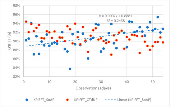Under SoAP, the regression model is statistically significant (significance f = 0.001501), indicating a meaningful relationship between non-defective parts and KPIFTT. In contrast, under CTdNP, the regression model is not statistically significant (significance f = 0.712023), suggesting that the relationship between non-defective parts and KPIFTT under coopetition practices is not as impactful. This finding indicates that the performance of KPIFTT under CTdNP requires ongoing monitoring, with necessary adjustments to ensure that the shift from current best practices results in actual performance improvements. To fully realize the potential benefits of technology-driven coopetition, it may be necessary to revisit and refine network practices by enhancing communication, setting more precise goals, and offering better incentives for cooperation.
