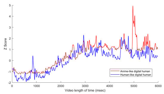 Following the approach used by Vecchiato et al. [], Z-scores of the EEG data were employed to compare emotional responses across different viewer subgroups in MATLAB 2021b software. Figure 1 and Figure 2 illustrate the average Z-score time series plots for all the participants while they were viewing the two narrative videos, demonstrating distinct patterns of EEG activity between the groups. Specifically, the anime-like experimental group exhibited significantly higher emotional responses than the human-like group across both alpha and beta waves.