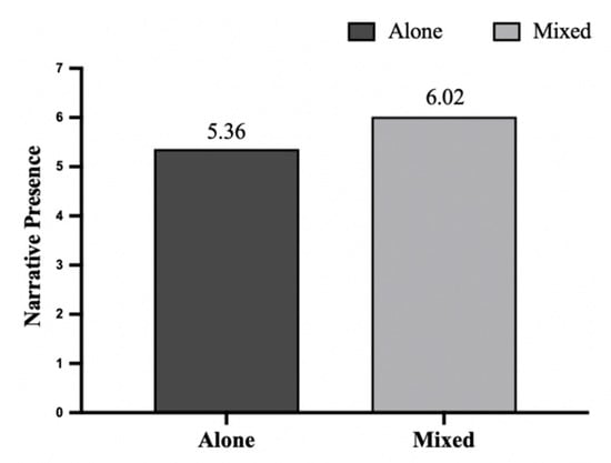 Using SPSS Statistics 29.0 software, a one-way ANOVA analysis with “narrative presence” as the dependent variable and “digital human narrative scenarios” as the independent variable showed that the participants perceived significantly more narrative presence in mixed narrative scenarios than in single narrative scenarios (Mmixed = 6.02, SD = 0.4; Malone = 5.36, SD = 0.92; F (1, 260 = 56.369), p < 0.001), see Figure 4). This suggests that mixed scenarios featuring digital and real humans evoke a stronger narrative presence than scenarios with only digital humans.