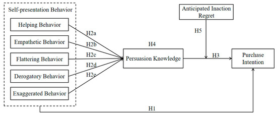 Flattering behavior involves actions that elevate the customer’s status or appearance to please them. Individuals often engage in flattering behavior to win favor or meet expectations and realize their interests [31,32]. During live-streaming interactions, particularly on short video platforms, streamers often flatter viewers to boost sales. Some streamers deliberately praise viewers with expressions like “The brothers who enter the live-streaming room are handsome, even their walking posture is handsome”. Psychologists suggest that individuals are more likely to accept positive statements about themselves [33]. Marketers often use this approach to create a positive impression, but it can also undermine consumers’ perception of sincerity, leading to a negative attitude toward the marketer and their products [34,35]. Previous research on flattering persuasion has primarily focused on offline shopping contexts. This paper argues that live streaming provides a mirrored performance scene where flattery and deliberate ingratiation are instantly recorded and magnified [36]. Furthermore, the spatial distance makes it challenging for consumers to form an emotional connection with the streamer, making flattering behavior more noticeable and deliberate. This, in turn, may negatively impact purchase intention. Based on these considerations, we propose the following hypothesis: