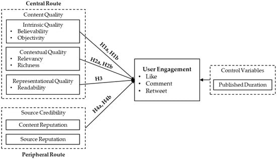 Representational quality refers to the level of clarity in presenting assessed information [42,43], which can be prominently exemplified by the readability within the content of CCPs, as indicated by Jin et al. [4] and Cai et al. [21]. Lee et al. [29] argue that directly informative content is associated with lower engagement on social media, implying that the amount of information within the content should be appropriate [32]. According to the effort–accuracy framework [66], due to limitations in information processing capacity, the final decision is made based on a compromise between making an accurate decision and minimizing cognitive effort. An excessive amount of information can exceed the cognitive load of users and result in suboptimal decision making. Lengthy expressions may pose comprehension challenges, whereas short ones could lack accuracy or completeness for users [60]. The presentation of comprehensive information should be concise and condensed; therefore, it is crucial to convey only the essential elements from the entirety of information. Consequently, readability measures the extent to which the content is effectively and comprehensively conveyed [52,60], which can reduce the cognitive efforts to be made before deciding to like, comment on, or retweet the content. Therefore, despite the varying cognitive input requirements for information processing across different forms of user engagement, we propose the following hypothesis: