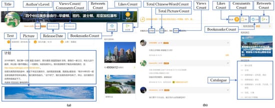 The data used for this study consist of travelogue content available on the MaBeeWoo platform (MaBeeWoo, https://www.mafengwo.cn/ accessed on 1 September 2024), the largest Chinese CCP dedicated to travelogues. This platform serves as a community where travelers openly share their extensive travel experiences, including dining options, lodging arrangements, transportation modes, sightseeing opportunities, shopping destinations, and recreational activities. The content is easily accessible to visitors without requiring any registration procedures. However, in order to utilize features such as liking, commenting, retweeting, or following someone on the travelogue page, visitors are required to log in using their phone number or email address. The MaBeeWoo dataset is highly suitable for estimating the impact of informational features on user engagement on CCPs due to four key reasons, as illustrated in Figure 2: (1) MaBeeWoo has minimal restrictions on content length but encourages visually appealing and detailed content through a star badge system provided by the platform. This ensures that sufficient informational features can be extracted. (2) Advertisements are rarely included in the travelogue content on MaBeeWoo, minimizing their influence on users’ engagement decision making beyond the inherent characteristics of the content itself. (3) MaBeeWoo offers grade certification to content creators based on their contributions, prominently displayed alongside the content interface and accessible to users. (4) MaBeeWoo enables registered users to engage with content creators and other registered users through likes, comments, bookmarks, and retweets within a dedicated travelogue interface. It should be noted that content creators do not possess the ability to directly delete these records.