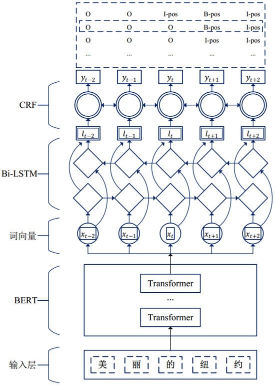 The deep learning model we selected for extracting entities and their corresponding sentiment is the BERT+Bi-LSTM+CRF model, as illustrated in Figure 3. The Bi-LSTM (Bidirectional Long Short-Term Memory) model, widely employed in named entity recognition [74], combines forward and backward LSTM models to capture contextual semantic information. The CRF (Conditional Random Field algorithm) model leverages adjacent label information to obtain optimal values, complementing the Bi-LSTM model. Additionally, the BERT (Bidirectional Encoder Representations from Transformers) model, a pre-trained language model, effectively addresses word polysemy issues. Consequently, this combination of models yields an optimized outcome in deep learning by effectively handling large volumes of text entities, contextual relationships, and word polysemy encountered in travelogue content [75].