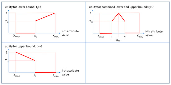 Next, we develop component utility functions that can approximate decision makers’ preferences defined by eliminating cutoffs strategy. Attribute values that do not fulfill the required threshold values are mapped to zero utility by the component utility function. The utility of an attribute value equal to the threshold value (lower or upper bound) is set to . According to the decision maker’s preference, the best attribute value is assigned to the utility one. Between the threshold and the best attribute value, the component utility function is modeled as a piecewise linear function connecting the utility values and 1.