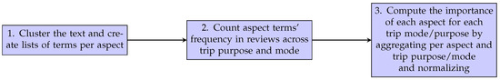 Figure 2 depicts this second phase of study 2, in which the prominence of each aspect per each travel mode or purpose is calculated using a metric we developed to assess the prominence of aspects for each mode and purpose group. The metric considers the occurrence of aspects’ terms in reviews of travelers with that purpose or travel model. In step 3, as depicted in Figure 2, the occurrences are aggregated and normalized and thus convey the differences in aspects’ prominence across the mode/purpose groups.