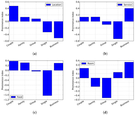 Figure 3 shows the prominence index for four aspects of the hotel for each trip mode. We can observe many differences in Figure 3a across the mode groups. For example, couples tend to write and care more about the hotel’s location than others, business travelers focus more on the hotel service than others, single travelers are significantly less interested in the hotel food than other groups, and so on. These trends are also consistent across the other two hotel aspects (price, X). Note that we could consider the 6-tuple as a sort of profile for each mode group. It is clear from these pictures that profiles differ significantly across the mode groups.