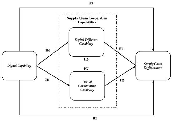 Digital collaborative capability is a “two-way” link capability for supply chain cooperation [55]. Digital collaborative capability emphasizes both the “digital resource output” and “digital resource input” of the enterprise. Through the output of digital resources, enterprises can realize the collaborative value co-creation of digital resources with supply chain members. With digital resource input, enterprises need to adjust their digital resource mix based on the newly entered digital elements. This “adjustment” is reflected in the enterprise adaptability to digital technology [22,23], and is also reflected in the enterprise digital capability. Enterprises with digital capability can quickly absorb the needs of digital transformation in the collaborative process [27,59,60], and thus, quickly adjust its organizational processes, structure, and technical elements. As a result, enterprises can better realize cross-border links, so as to better collaborate with on-chain members to reconstruct and innovate the value of digital resources. Based on the arguments presented above, we propose the following hypotheses: