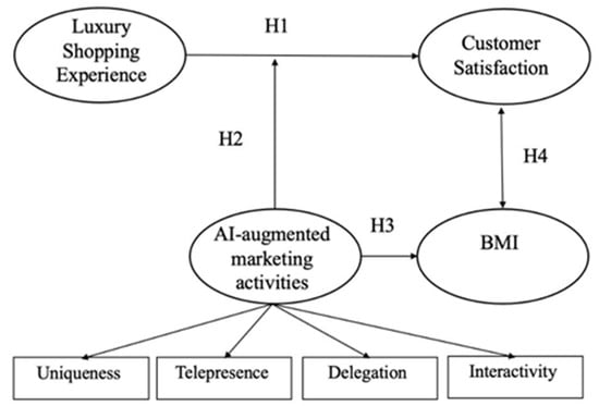 Furthermore, this study addresses key empirical gaps in AI-empowered customer experiences in the context of luxury shopping. First, we conduct an experimental study to determine whether AI technologies enhance customer satisfaction in these settings. Our findings deepen the understanding of AI’s influence on the luxury customer journey. Second, we also identified specific dimensions of luxury shopping that are most affected by AI marketing efforts [12,19] and explored how AI marketing can catalyze BMI, impacting customer satisfaction. This study expands the interactive marketing literature and clarifies the relationship between AI-driven satisfaction and BMI in luxury retail. Third, unlike traditional retail environments, our findings suggest that the unique context of luxury shopping requires new theoretical approaches [16]. By blending traditional values with innovative marketing strategies, luxury firms can leverage AI to innovate their business models and enhance digital marketing efforts [18,20]. Ultimately, this study enriches our understanding of AI in refining customer satisfaction and driving the BMI in the luxury sector. Therefore, our research questions are as follows:
