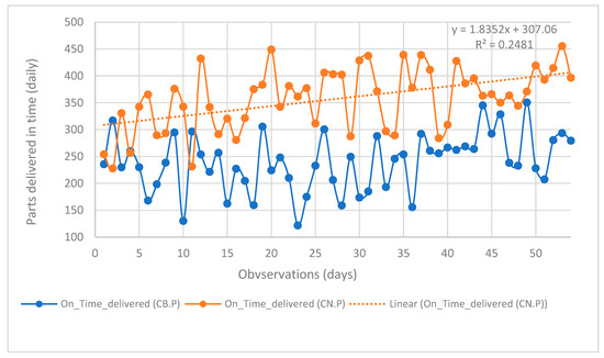 The positive slope of 1.8352 indicates a steady increase in the number of parts delivered daily on time. This upward trend demonstrates the boost given by coopetition practices in enhancing operational responsiveness, a critical component of the BIM.4D. However, the coefficient of determination (R2 = 0.2481) suggests that this linear model explains approximately 24.81% of the variability in on-time delivery, indicating a moderate but not linear solid relationship between the days and the on-time delivery of parts.