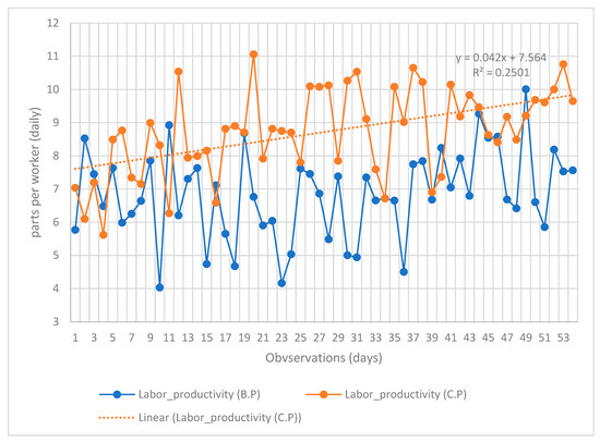 Labor productivity observed daily over 54 days.