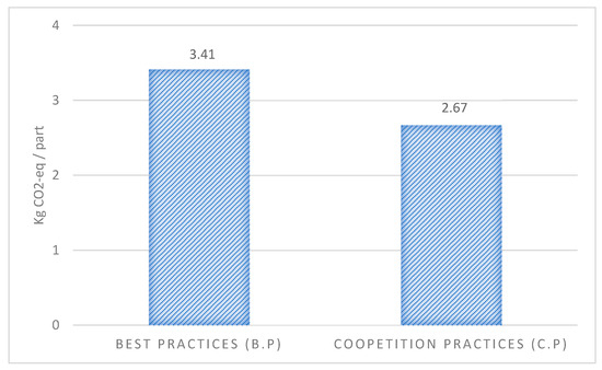 Under B.P, the stone companies recorded an average energy consumption of 4692 kWh per day, resulting in a KPICO2-eq of 3.41 kg CO2 per part. However, with the implementation of C.P., energy consumption decreased to 4071 kWh per day on average, thereby reducing the KPICO2-eq to 2.68 kg CO2 per part produced. This represents a 21.8% reduction in carbon emissions per part, underscoring the significant environmental benefits that coopetition practices can deliver.