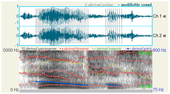 For the audio data of interest in this study, we used the Ultimate Vocal Remover v5 [87] software to isolate the human voice from the audio. We then processed the isolated vocal signals using Praat 6.2, a widely used audio analysis software that can extract and analyze various acoustic features from audio files. We began by segmenting the voice signals using Praat’s audio framing function. This process involves dividing a series of sound data points into shorter segments to obtain stable and informative data within appropriate time frames. Following common practices in audio processing, we set the frame length to 20 to 30 milliseconds, using 512 data points per frame and a frame shift of 256 data points. Each frame contained 512 data points, with 256 data points overlapping with the next frame. After the audio framing, we applied a Hanning window function to each frame of the voice signal to ensure continuity between frames. Once the audio framing and windowing were completed, we performed a short-time Fourier transform (STFT) to obtain the time-domain and frequency-domain features of the voice signals. Following these preprocessing steps, Praat generated spectrograms of the input audio and extracted fundamental features such as speech rate, pitch, and loudness. Figure 1 shows an example of feature extraction and a spectrogram generated by Praat software.