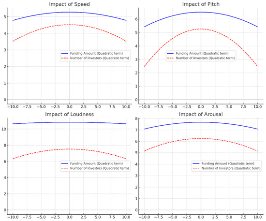 Next, this study explored the impact of each individual audio feature on the number of investors. As shown in Models 5 to 8 in Table 4, all four models exhibited good fit (χ2 > 53.25, p < 0.001). Hypothesis testing results were as follows: speech rate had a significant positive impact on the number of investors (β = 0.118, p < 0.001), and its quadratic term showed a significant negative impact (β = −0.010, p < 0.001), indicating an inverted-U curve. For pitch, the linear term had a significant positive impact on the number of investors (β = 0.165, p < 0.001), and the quadratic term had a significant negative impact (β = −0.028, p < 0.001), also showing an inverted-U relationship. In terms of loudness, the linear term had a significant positive impact on the number of investors (β = 0.185, p < 0.001), and the quadratic term was significantly negative (β = −0.012, p < 0.001), indicating a nonlinear relationship. The results for emotional arousal were similar, with the linear term having a significant positive impact on the number of investors (β = 0.075, p < 0.001), and the quadratic term being significantly negative (β = −0.011, p < 0.001), displaying an inverted-U characteristic. These results once again support all the hypotheses proposed in this study. The relationships between the independent variables and the dependent variables are illustrated in Figure 2.