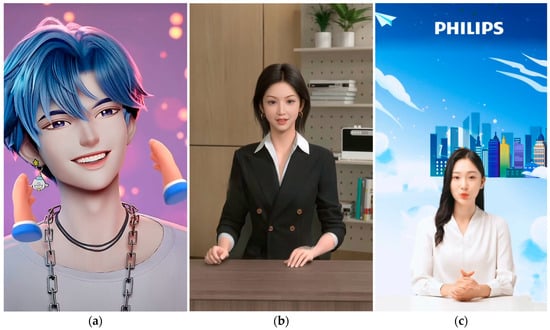 Virtual influencers, also known as AI synthesized streamers, digital human streamers, machine streamers, and virtual streamers, are intelligent machines that can replace (or partially replace) humans in broadcasting or live broadcasting tasks [,,]. The term “virtual influencer” as used in this study refers to the “cloning” of a human streamer’s “doppelganger” based on virtual technology. It has the same capability of live broadcasting as a human influencer, and its appearance includes various anthropomorphic features []. It is trained through modeling by using speech, lip alignment, expression migration, and deep learning, and it can convey the same information as a human influencer. Anthropomorphization is a crucial feature of AI technology [,,]. The appearance of virtual influencers is the most important factor impacting a user’s visual cues in the metaverse [,,], and it can directly influence a consumer’s interactive experience []. Therefore, it is important to examine the extent of anthropomorphization of the images of virtual influencers.