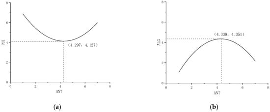 We then plotted the curvilinear relationships in Hypotheses 1 and 2 by using vertices in Origin 2022. As shown in Figure 3a, consumers’ purchase intention first reached its minimal value as image anthropomorphization increased, but it then increased with the continued enhancement in image anthropomorphization. When the value of image anthropomorphization was 4.297, that of consumers’ purchase intention reached its minimal value of 4.127. Similarly, Figure 3b shows that algorithmic aversion first reached its maximum value with an increase in image anthropomorphism and then decreased when image anthropomorphism continuously increased. When the value of image anthropomorphism was 4.339, that of algorithmic aversion was 4.351. Figure 3 thus further supports Hypotheses 1 and 2. This shows that there is a U-shaped relationship between image anthropomorphism and consumers’ purchase intention, and algorithmic aversion has a U-shaped relationship of inhibition, followed by activation, followed by restriction, respectively. Moreover, when consumers’ purchase intention and the algorithmic aversion were at their minimal values, the value of image anthropomorphization was closest to that of the medium-realistic image (Mcartoon = 2.7711, SD = 1.119; Mmedium-realistic = 4.3972, SD = 1.042; Mhyper-realistic = 6.2452, SD = 0.473), with a difference of only 0.042. We can conclude that the anthropomorphization of the image of the virtual influencer is not identical to its image. When the image of the virtual influencer was in the medium-realistic category, consumers exhibited the highest algorithmic aversion and the lowest purchase intention. Table 10 reports the non-linear equations relating image anthropomorphism with consumers’ purchase intention and algorithmic aversion, with F-values of 151.76784 and 71.34533, respectively. Both of them were significant at the 0.01 level, which once again verifies Hypotheses 1 and 2.