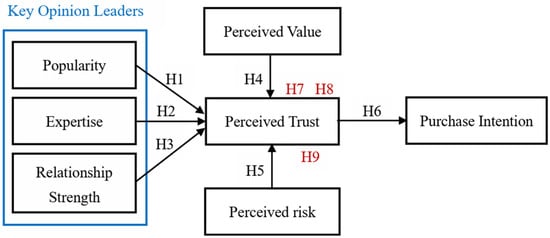 The popularity of KOLs within social media landscapes augments consumers’ recognition of informational credibility [31]. The “celebrity effect” heightens the appeal of KOL through increased exposure and societal influence [32]. Research illustrates that KOLs’ popularity and perceived trust critically influence purchasing intentions, mediated by virtual interaction and emotional engagement [33], whereas high-audience-rated bloggers and vloggers exert formidable positive impacts on consumer purchase behaviors [34,35]. Thus, we hypothesize the following: