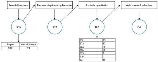 Recognizing the rapid evolution of digital interaction studies, an expanded search was conducted on 5 April 2024, incorporating the keyword “digital intimacy”. This supplementary search retrieved 102 papers from the Web of Science and 843 from Scopus. While many of these papers discussed intimacy in social or non-commercial contexts, few focused on digital customer intimacy. After manual screening, 10 relevant papers were added, resulting in a final sample of 157 studies. The entire filtering process is visualized in Figure 2.