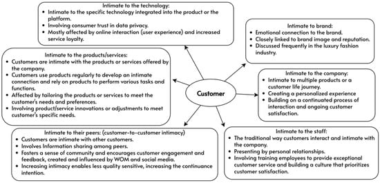 Moreover, customer intimacy has been identified in different dimensions. In the literature, it has been explored between customers and brands [35], customers and companies [36], customers and their peer customers [37], and customers and products [38]. The multifaceted nature of customer intimacy has resulted in differing definitions across studies, posing a challenge for in-depth research.