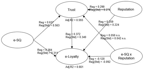 - The coefficient of e-SQ x reputation → trust (reg. coefficient = −0.050) was non-significant, indicating that reputation does not moderate the relationships between e-SQ and trust, thus failing to support Hypothesis 4.