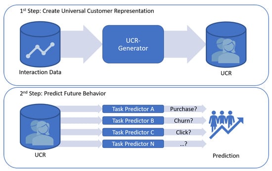 Decoupled, two-stage approach for predicting customer behavior based on historical interaction data: In the first stage, universal customer representations are learned, which are used as input in the second stage to train task-specific prediction models.
