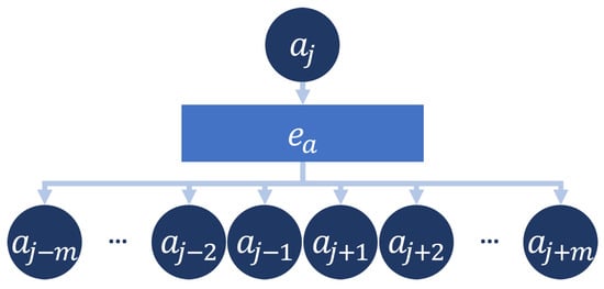 A decade ago, Mikolov et al. [56] demonstrated that the similarity between two words in a given vector space is connected to their respective contexts in which the context is defined by the surrounding words. With our approach, we will show that this analogy also applies to sequences of customer interactions. For this, we use the skip-gram approach which is shown in Figure 3. Specifically, given a customer activity with , we describe the context with length with of this activity . The context is described by the activities that happened before activities and that happened after activity of the same customer. The goal is to learn the embedding representation for all possible customer activities with using a single-layer neural network with trainable parameters that maximizes the likelihood of the context . This yields the objective function,