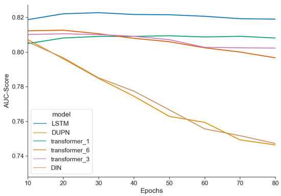 Consequently, a more detailed analysis was conducted. Figure 5 illustrates the AUC scores for purchase prediction on the test data for the UCR-baseline DUPN, the CTR-baseline DIN, the three Transformer models, and LSTM across different training epochs. As is evident, all models demonstrate a decline in performance over time, particularly DUPN and DIN. The observed overfitting can be attributed to the excessive number of parameters in the models. For instance, DIN has a total of 747,186 parameters, while DUPN has 212,710 parameters. In contrast, the one-layer Transformer has only 25,441 parameters, the three-layer Transformer has 50,849 parameters, and the six-layer Transformer has 88,961 parameters. In contrast, the LSTM model utilizes a comparatively modest number of parameters, with a total of 8481, a factor that likely contributes to its superior generalization across diverse use cases and tasks.This behavior is consistent across all the investigated tasks and datasets.